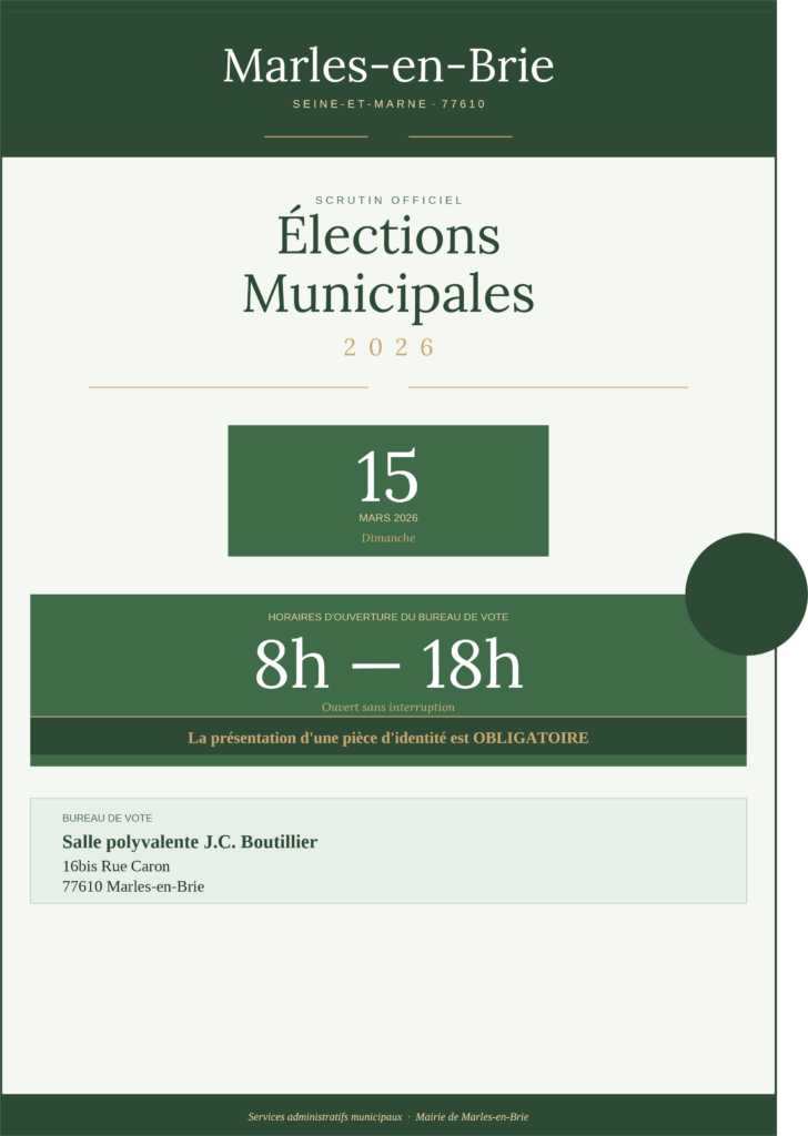 Élections Municipales 10 mars 2026 / Commentaires fermés sur Élections Municipales Dimanche 15 Mars Bureau de vote ouvert de 8h à 18h sans interruption Salle Polyvalente J.C. Boutillier16bis rue Caron77610 Marles-en-Brie La présentation d’une pièce d’identité est OBLIGATOIRE